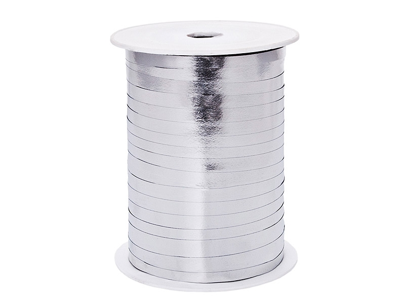 Wstążka metalizowana wąska w kolorze srebrnym, szerokość 5 milimetrów, długość 225 metrów.