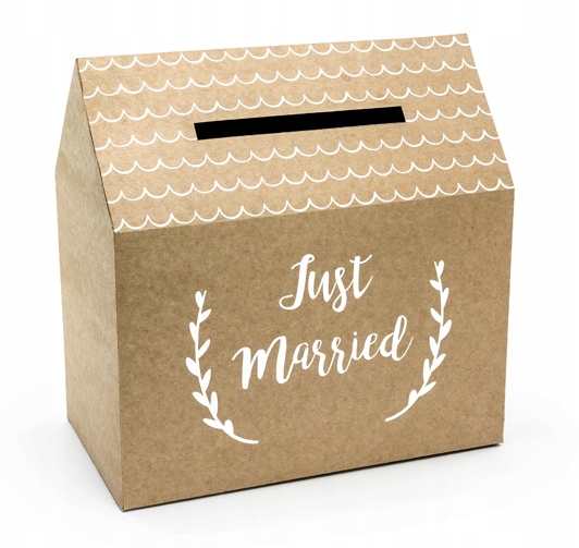 Pudełko na koperty wykonane z kraftowego papieru z białym napisem Just Married