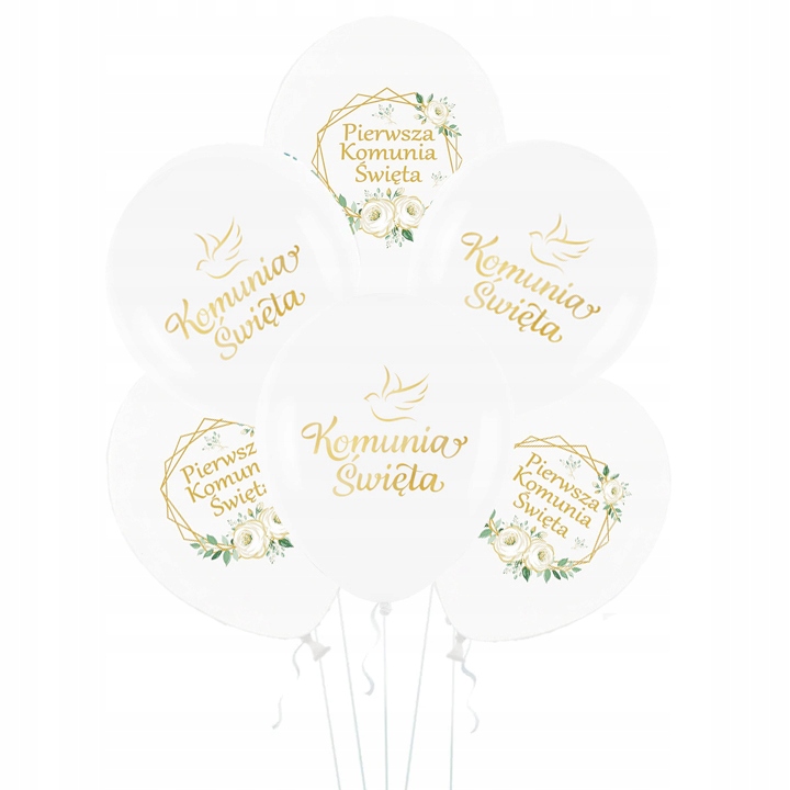 - 6 białych balonów z komunijnym nadrukiem 30 cm