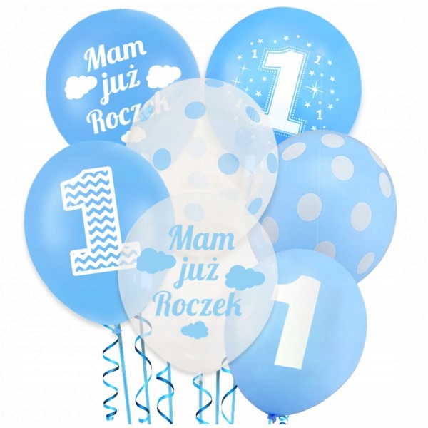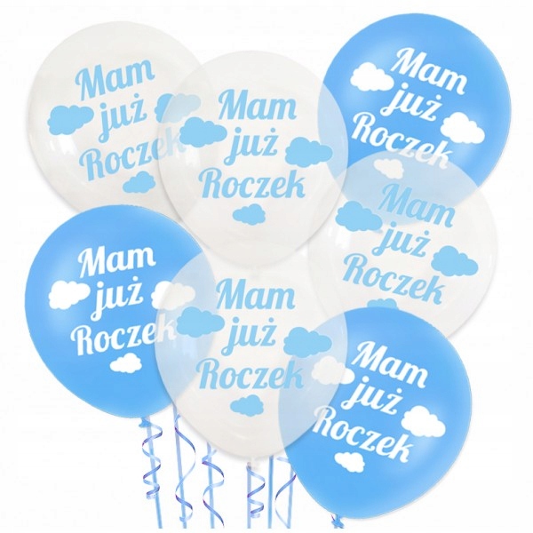 Na innych aukcjach możesz zakupić inne, niebieskie i transparentne balony do zestawu na pierwsze urodzinki.
