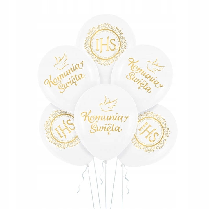 • 6 białych balonów ze złotym nadrukiem komunijnym