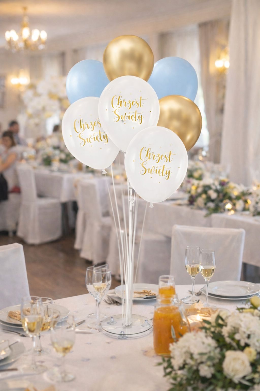 Połączenie złotego chromu, delikatnego błękitu i białych balonów z napisem „Chrzest Święty” tworzy klasyczną, elegancką kompozycję.