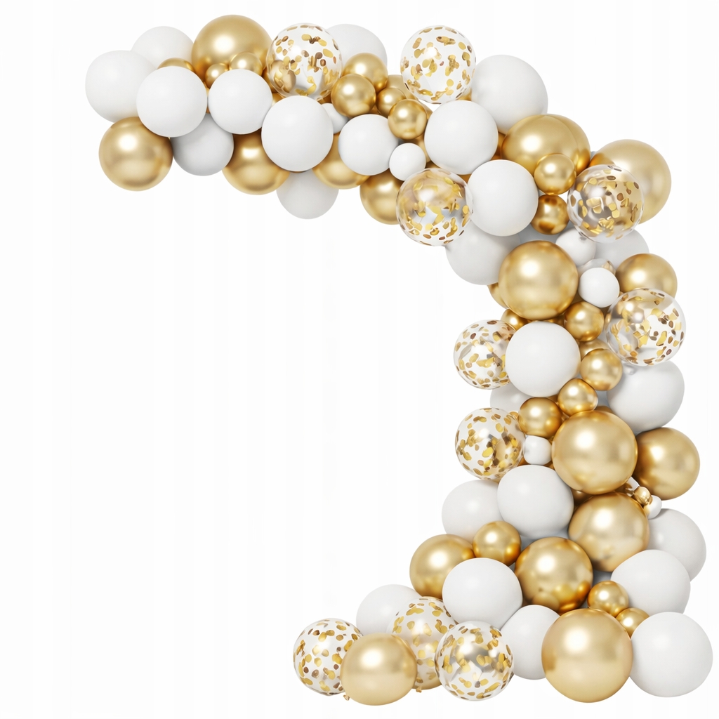 Stwórz wyjątkową dekorację na przyjęcie dzięki efektownej girlandzie balonowej biało-złotej z konfetti.