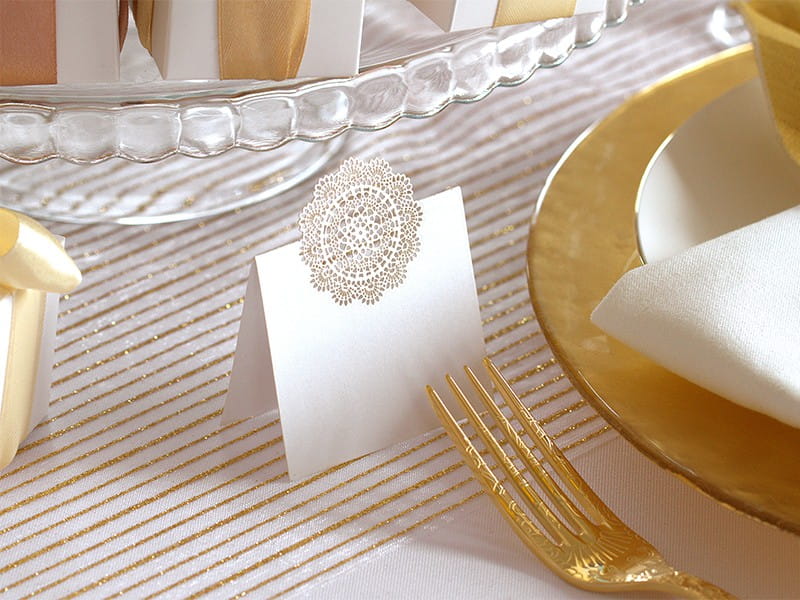 Organza w kolorze białym ze złotym, brokatowym, jednostronnym nadrukiem, wymiary 0,48x9 metrów.