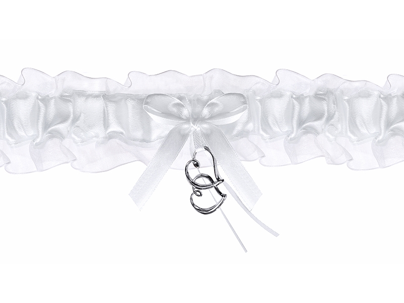 Podwiązka szyfonowa w kolorze białym z białą, satynową kokardką i serduszkami, szerokość około 5 centymetrów.