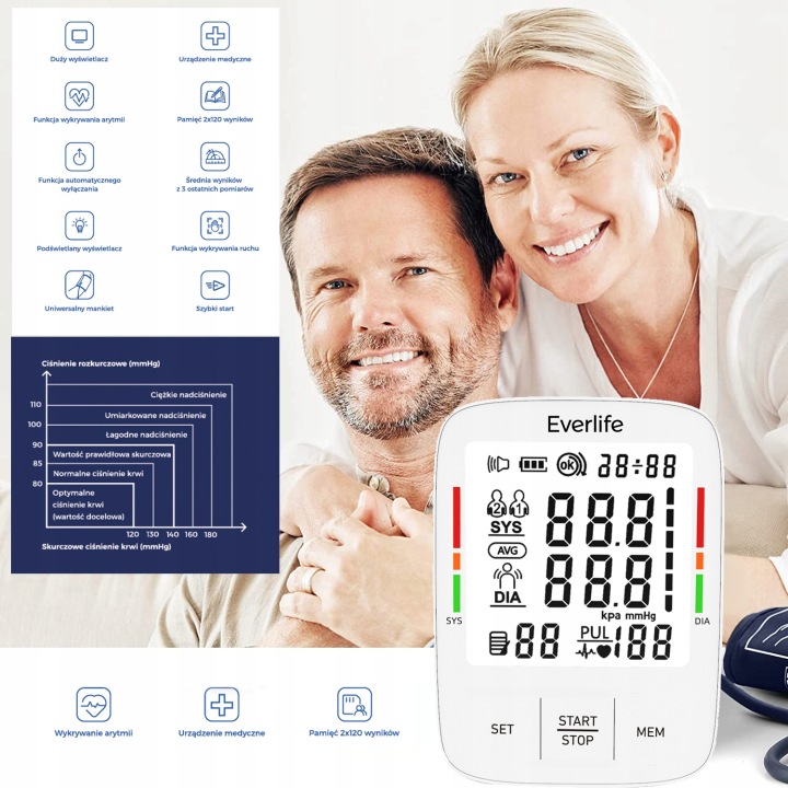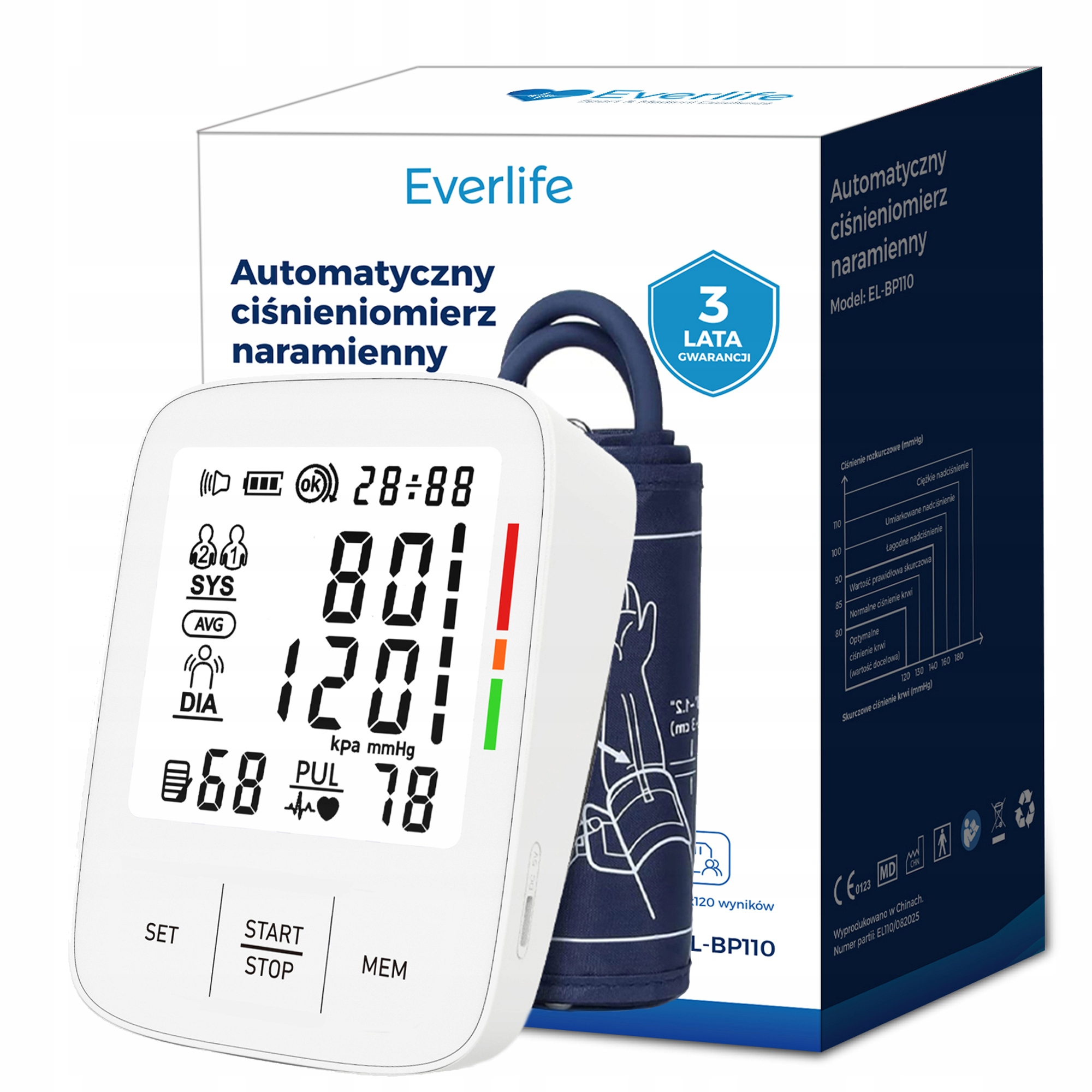 Profesjonalny ciśnieniomierz naramienny Everlife medyczny LCD pamięć 2x120