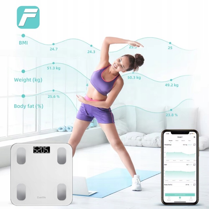 ✅ Everlife - Inteligentna Waga Łazienkowa z Aplikacją analityczną w języku polskim i czytelnym LED