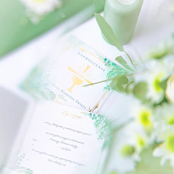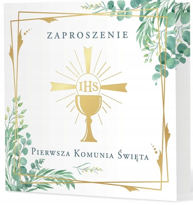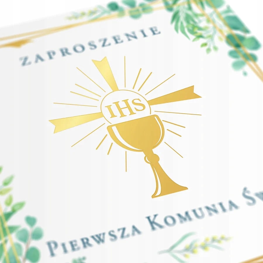 Eleganckie zaproszenie na Pierwszą Komunię Świętą ze złotymi motywami na biało-zielonym tle. Złote elementy - kielich z hostią umieszczony, w przesuniętych względem siebie ramkach, pięknie podkreślają zielone gałązki z listkami o różnych kształtach i subtelne zielone cieniowanie tła.