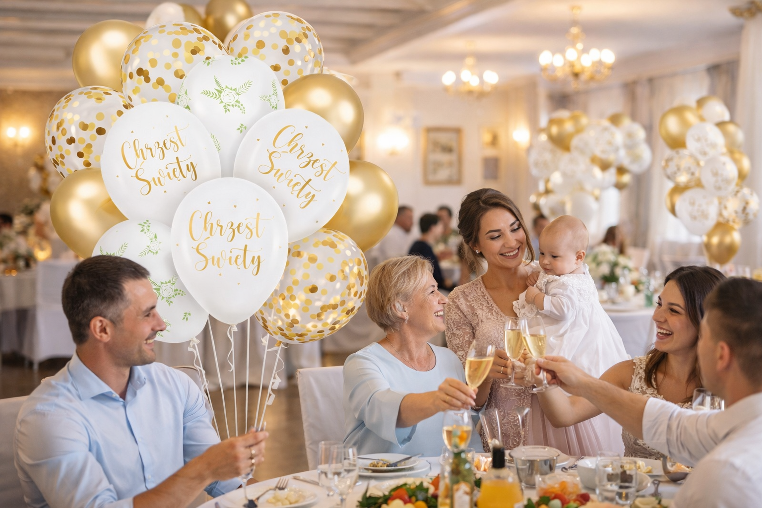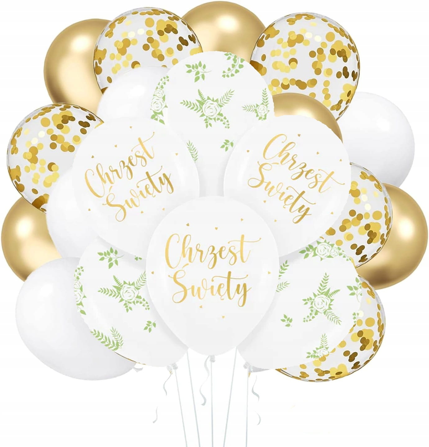 Stwórz wyjątkową aranżację na uroczystość Chrztu Świętego dzięki eleganckiemu połączeniu bieli, złota i subtelnej zieleni. Zestaw zawiera balony z napisem, pastelowe, chromowane oraz transparentne z konfetti, co pozwala stworzyć efektowną kompozycję.