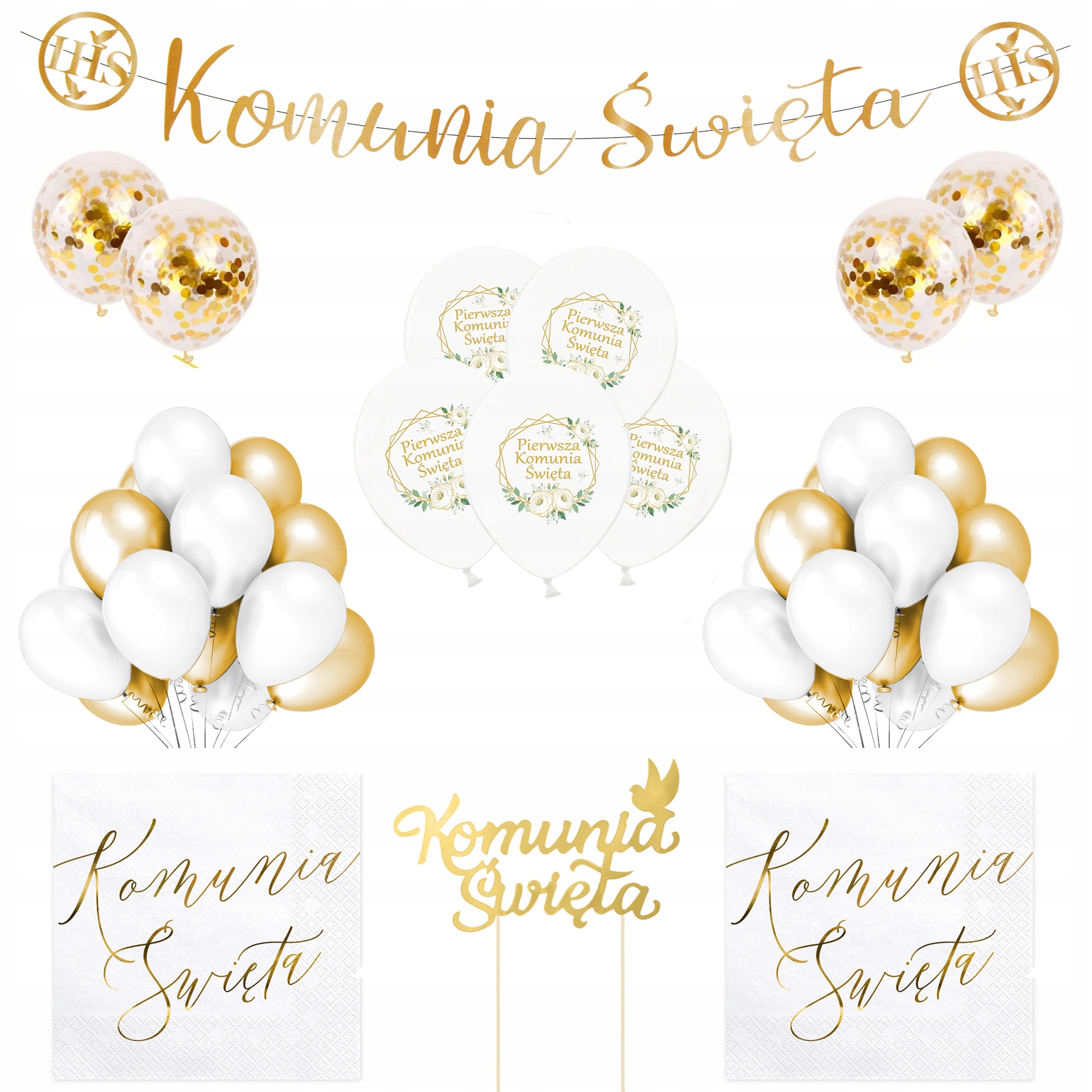 Zestaw I Komunia Święta Balony białe i złote Serwetki Baner Topper 55el