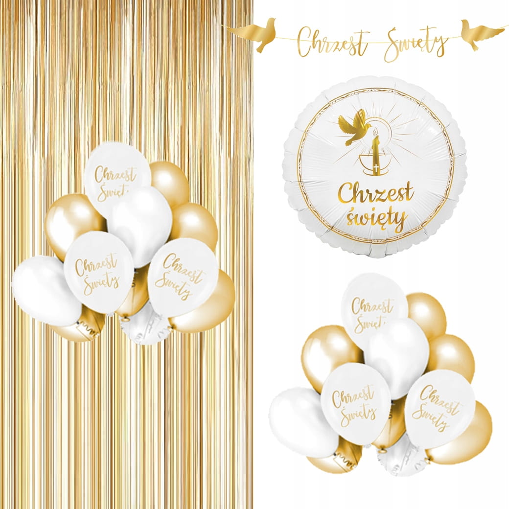 To gotowy zestaw, który oszczędza czas i ułatwia organizację przyjęcia. Połączenie białych balonów, złotych chromów, komunijnego nadruku, dużego balonu foliowego oraz kurtyny daje elegancki efekt wizualny i pozwala stworzyć dekorację, która wygląda spójnie i nowocześnie. Oferta podaje też możliwość pompowania balonów powietrzem lub helem, co daje większą swobodę aranżacji.