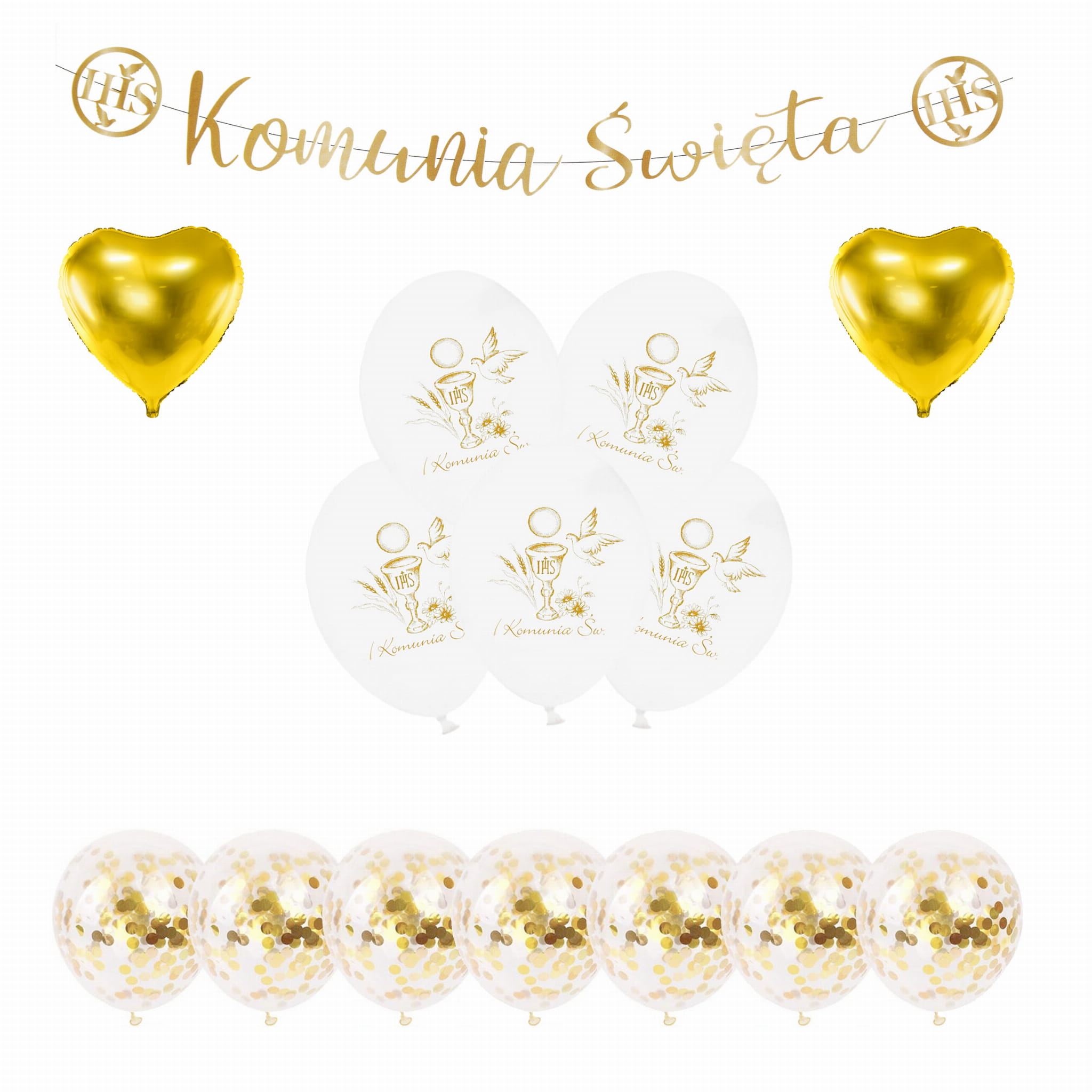 Zestaw świetnie nadaje się do dekoracji stołu komunijnego, ściany za stołem, słodkiego stołu oraz miejsca do rodzinnych zdjęć. Balony z nadrukiem podkreślają charakter uroczystości, złote serca dodają elegancji, a transparentne balony z konfetti rozjaśniają całą aranżację i nadają jej bardziej dekoracyjny wygląd.