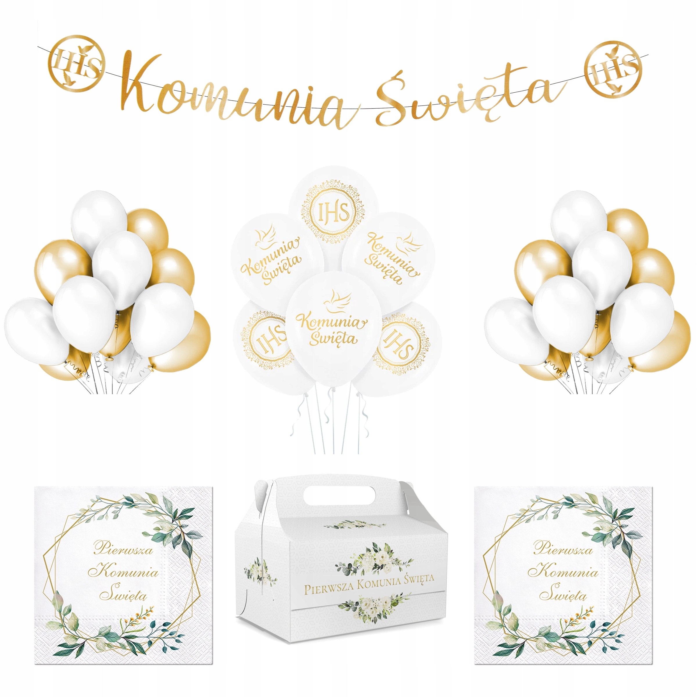 Zestaw komunijny Eukaliptus balony baner serwetki pudełka