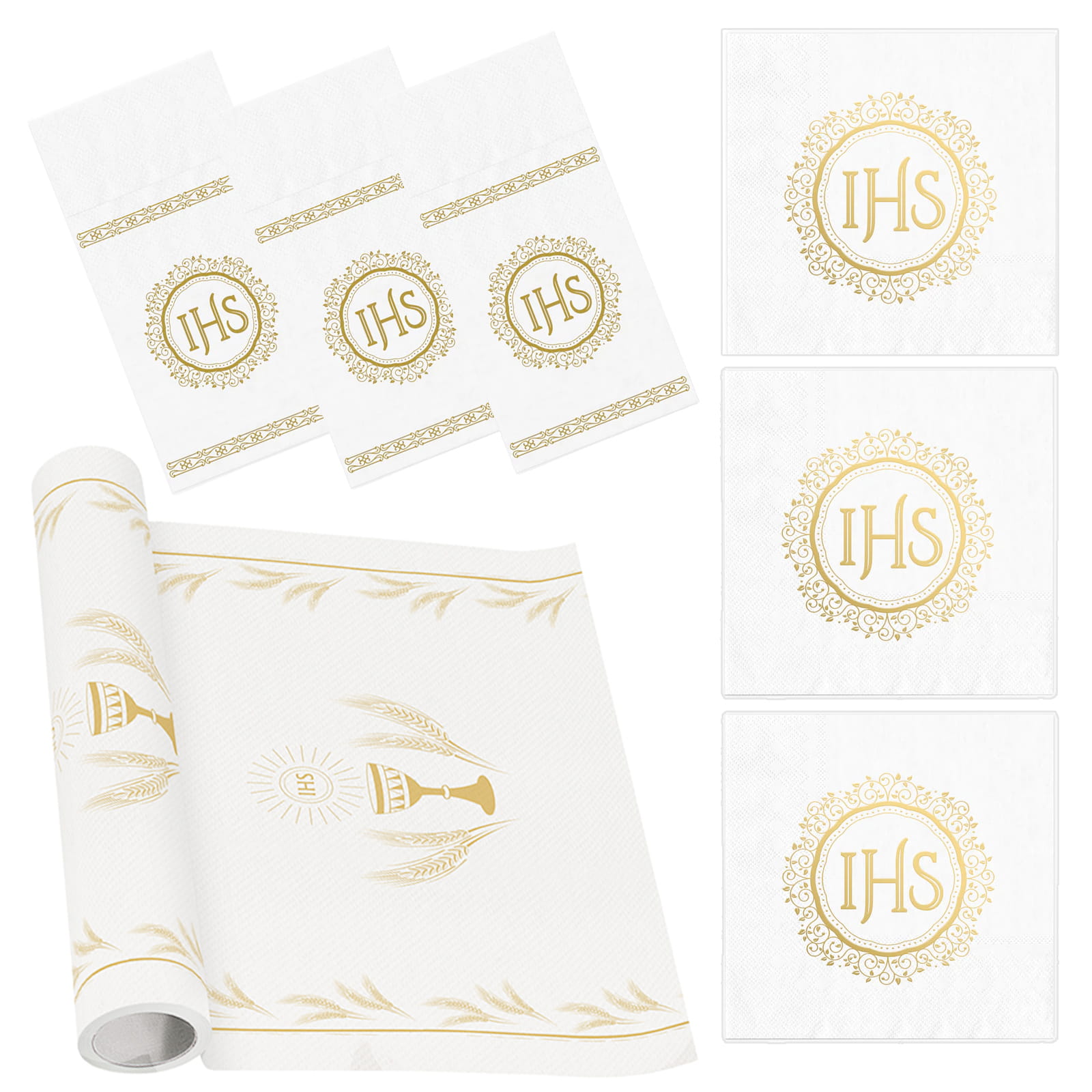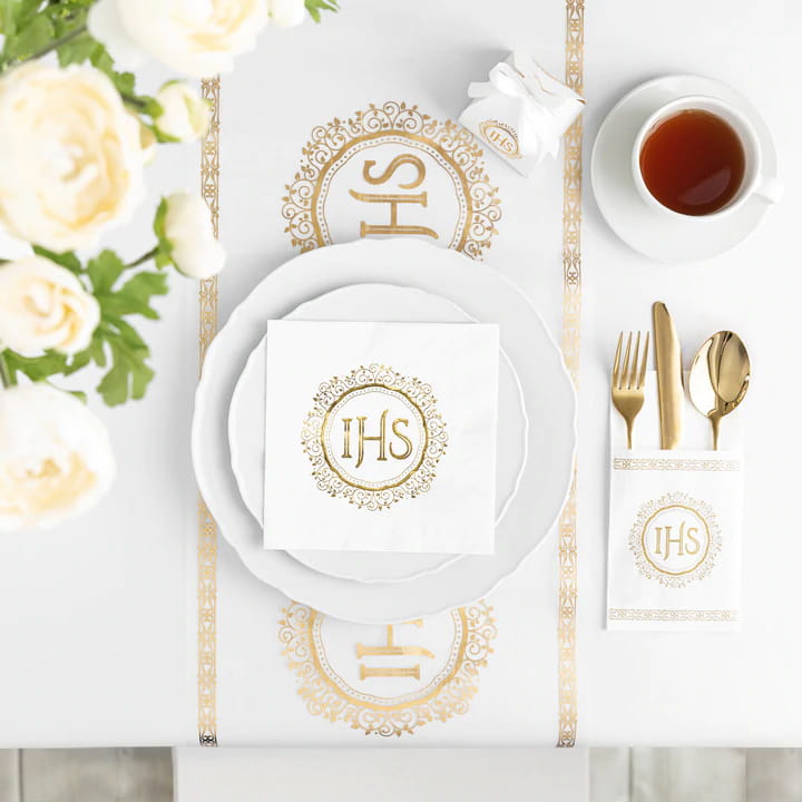 Zestaw łączy subtelną biel, złoty ornament oraz napis IHS, dzięki czemu prezentuje się odświętnie, lekko i bardzo estetycznie. Motyw roślinny i delikatne wykończenie dobrze pasują zarówno do przyjęcia w domu, jak i w restauracji czy sali
