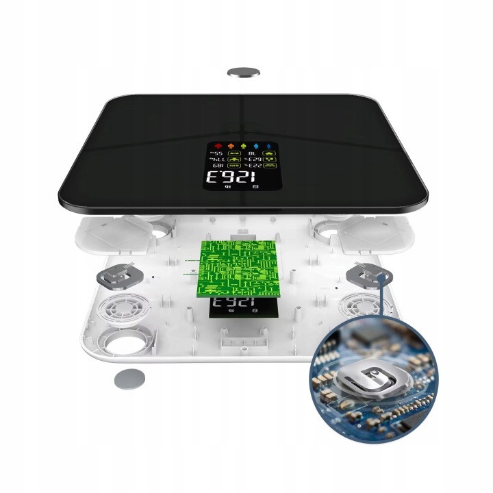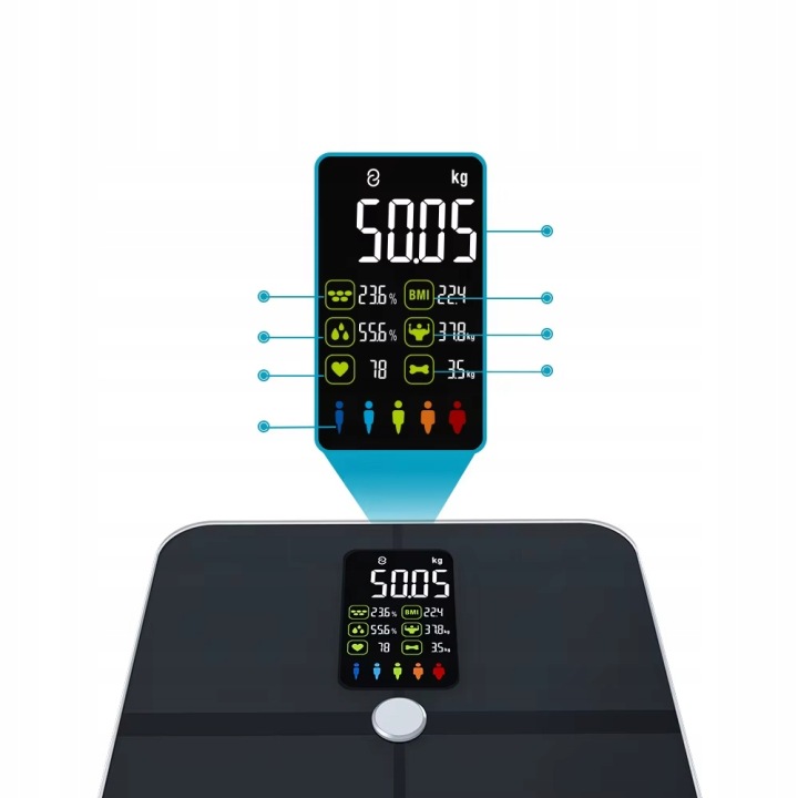 - Kolorowy wyświetlacz LED pokazujący wagę oraz 7 najważniejszych parametrów Twojego ciała